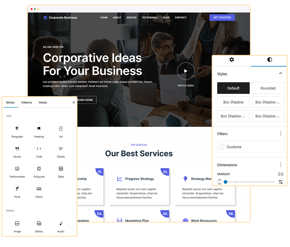 Blockskit Corporate Business is modern block-based theme where you can build your own unique looking website by using WordPress Blocks Editor. No coding required.