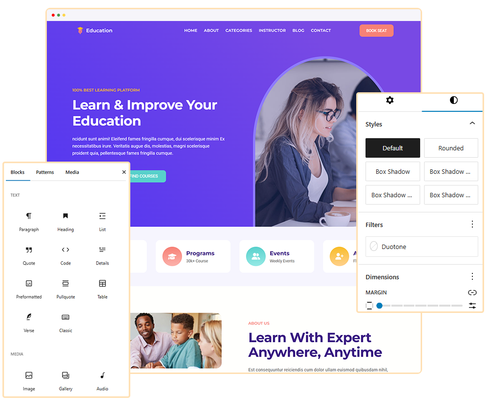Blockskit Education is a modern and versatile WordPress theme designed for various types of websites including academy, classes, course, courses, education, education wordpress theme, elearning, learning, learning management system, lms, online education, teacher, teaching, training, university and more. It offers full-site-editing, allowing easy customization of all aspects of your site. With multiple templates, patterns, and style variations, it’s suitable for different aesthetics.
