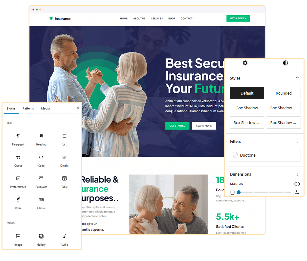 Blockskit Insurance is modern block-based theme where you can build your own unique looking website by using WordPress Blocks Editor. No coding required.