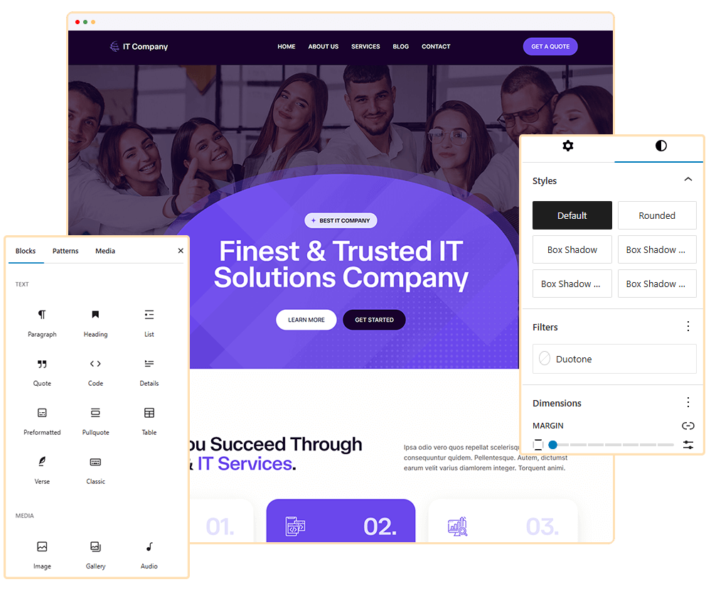 Blockskit IT Company is a modern, versatile FSE WordPress theme designed for  agency, business, consulting, creative, cyber security, data, digital agency, it services, startup, technology company, it solutions, software, startup, technology, technology service and other IT Company websites—no coding required. With full-site editing, you can easily customize every aspect of your site, including headers and footers. Featuring multiple templates, patterns, and style variations, it adapts seamlessly to various aesthetics and business needs.