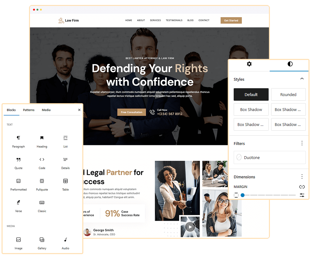 Blockskit Law Firm is a modern, versatile FSE WordPress theme designed for attorney, case studies, corporate law, criminal defense, family law, law firm, Law Practice, legal consultancy, legal consultation, legal results, legal services, litigation services, professional lawyer, and other Law Firm websites—no coding required. With full-site editing, you can easily customize every aspect of your site, including headers and footers. Featuring multiple templates, patterns, and style variations, it adapts seamlessly to various aesthetics and business needs.