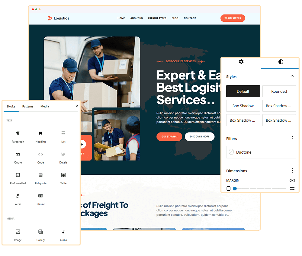 Blockskit Logistics is modern block-based theme where you can build your own unique looking website by using WordPress Blocks Editor. No coding required.
