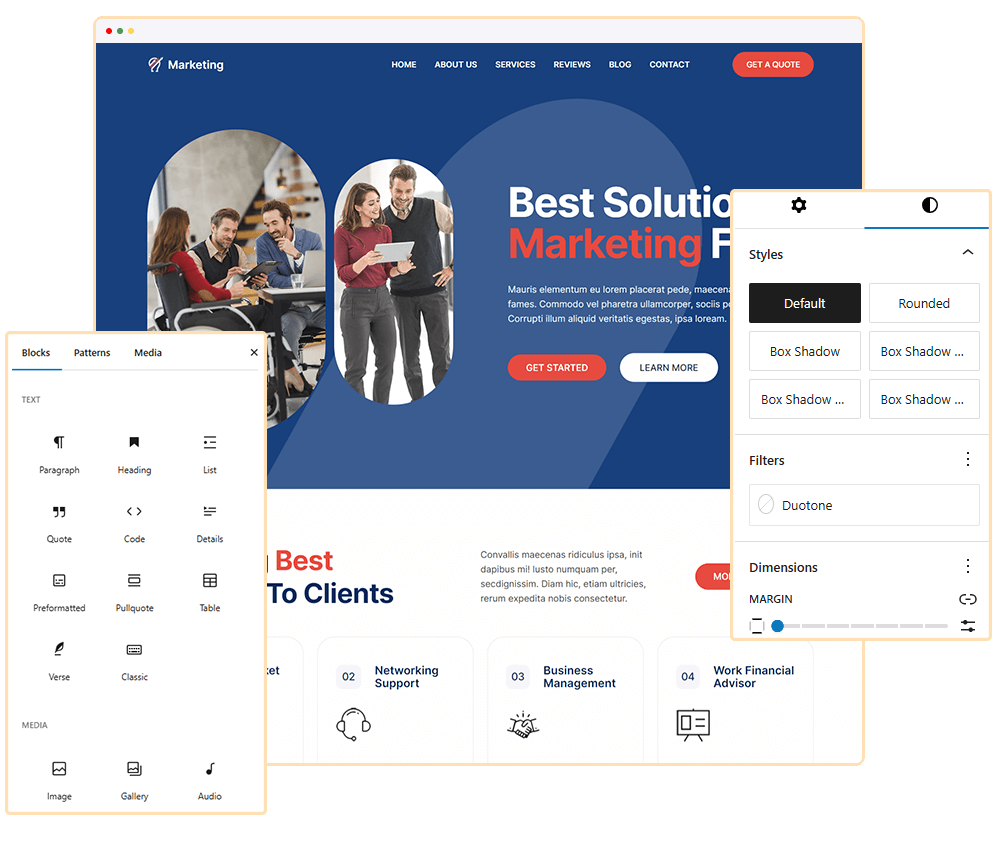 Blockskit Marketing is a modern and versatile WordPress theme designed for various types of websites including advertising, agency, blog, business, corporate, creative, design, finance, investments, management, marketing, portfolio, smm, startup, web design and more. It offers full-site-editing, allowing easy customization of all aspects of your site. With multiple templates, patterns, and style variations, it’s suitable for different aesthetics.