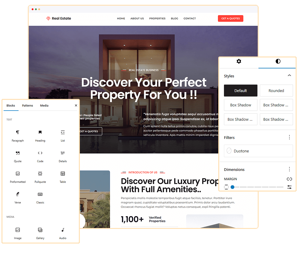 Blockskit Real Estate is a modern, versatile FSE WordPress theme designed for apartment, architecture, broker, building, construction, decorations, home, house, interior, interior designer, modern, property, property agency, real estate and other Real estate websites—no coding required. With full-site editing, you can easily customize every aspect of your site, including headers and footers. Featuring multiple templates, patterns, and style variations, it adapts seamlessly to various aesthetics and business needs.